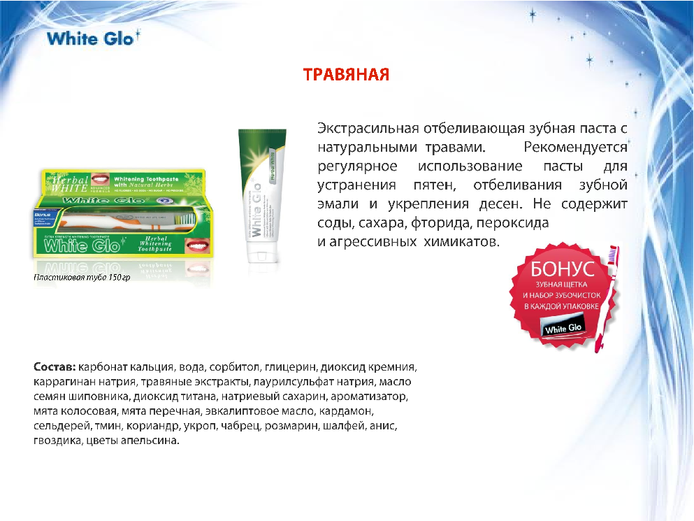 Экстрасильная отбеливающая зубная паста с натуральными травами и минералами. В составе пасты богатое витаминами А, С и Е масло семян шиповника, которое повышает защитные свойства слизистой оболочки полости рта. Не содержит соды, сахара, фторида, пероксида и агрессивных химикатов. Зубная щетка из высококачественной экстрагустой щетины DuPont вместе с микрочастицами в составе пасты мягко очищает поверхность зубов, способствует их эффективному отбеливанию и удалению пятен.
