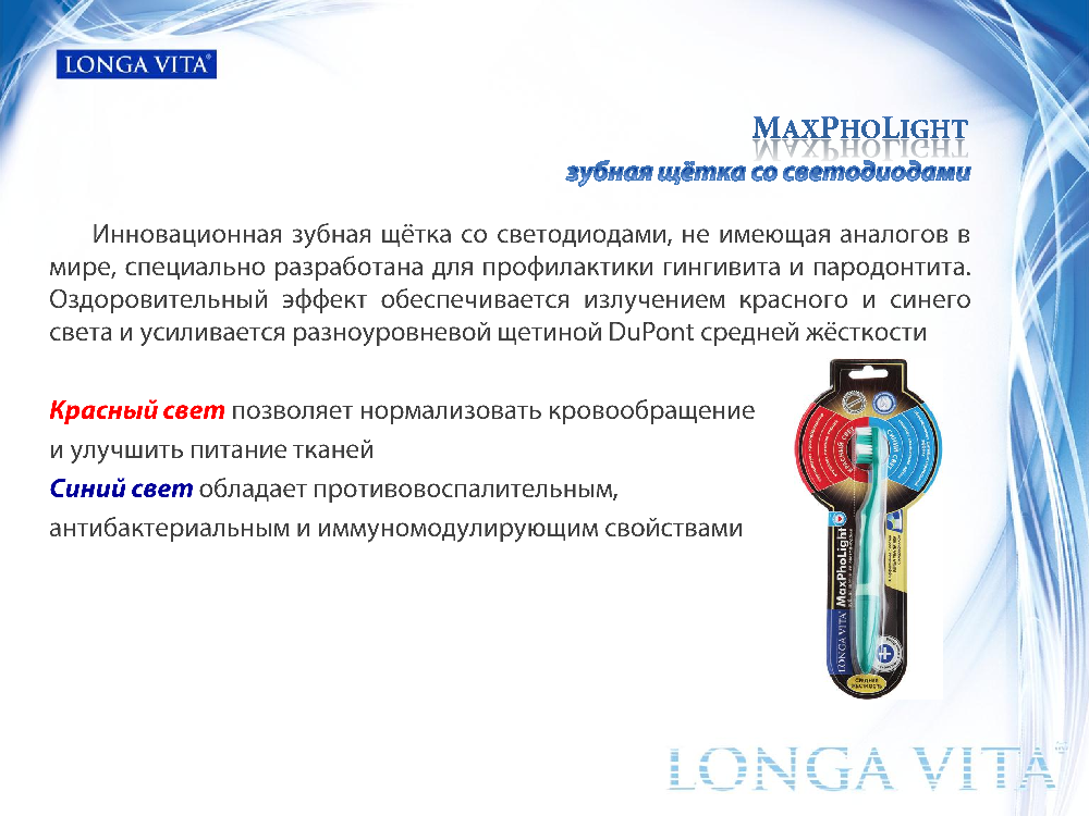 Для усиления лечебного эффекта рекомендуется использовать щетку в комплексе с пастой LONGA VITA с хлорофиллом. Под воздействием красного излучения щетки из хлорофилла выделяется активный кислород, который устраняет болезнетворные бактерии, снимает воспаление десен и ускоряет заживление мелких ранок.