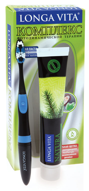 Комплекс фотодинамической терапии LONGA VITA включает зубную щётку со светодиодами LONGA VITA MaxPhoLight (в эксклюзивном чёрном дизайне) и зубную пасту с натуральными компонентами LONGA VITA NATURA.